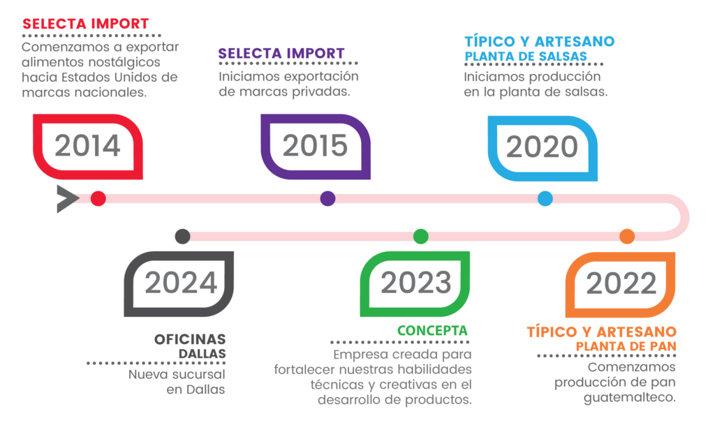 Desde 2014, en Grupo Selecta Import hemos llevado con orgullo un pedacito de Guatemala al mercado latino en Estados Unidos. Nuestro crecimiento nos llevó a crear Típico y Artesano, una fábrica especializada en salsas y pan tradicional con el auténtico sabor guatemalteco. Apostando por la innovación, fundamos Concepta, nuestra empresa dedicada al desarrollo de productos. En 2024, dimos un paso más con la apertura de Selecta Import en Dallas, acercándonos aún más a nuestros clientes. ¡Seguimos creciendo para compartir lo mejor de nuestros productos contigo!